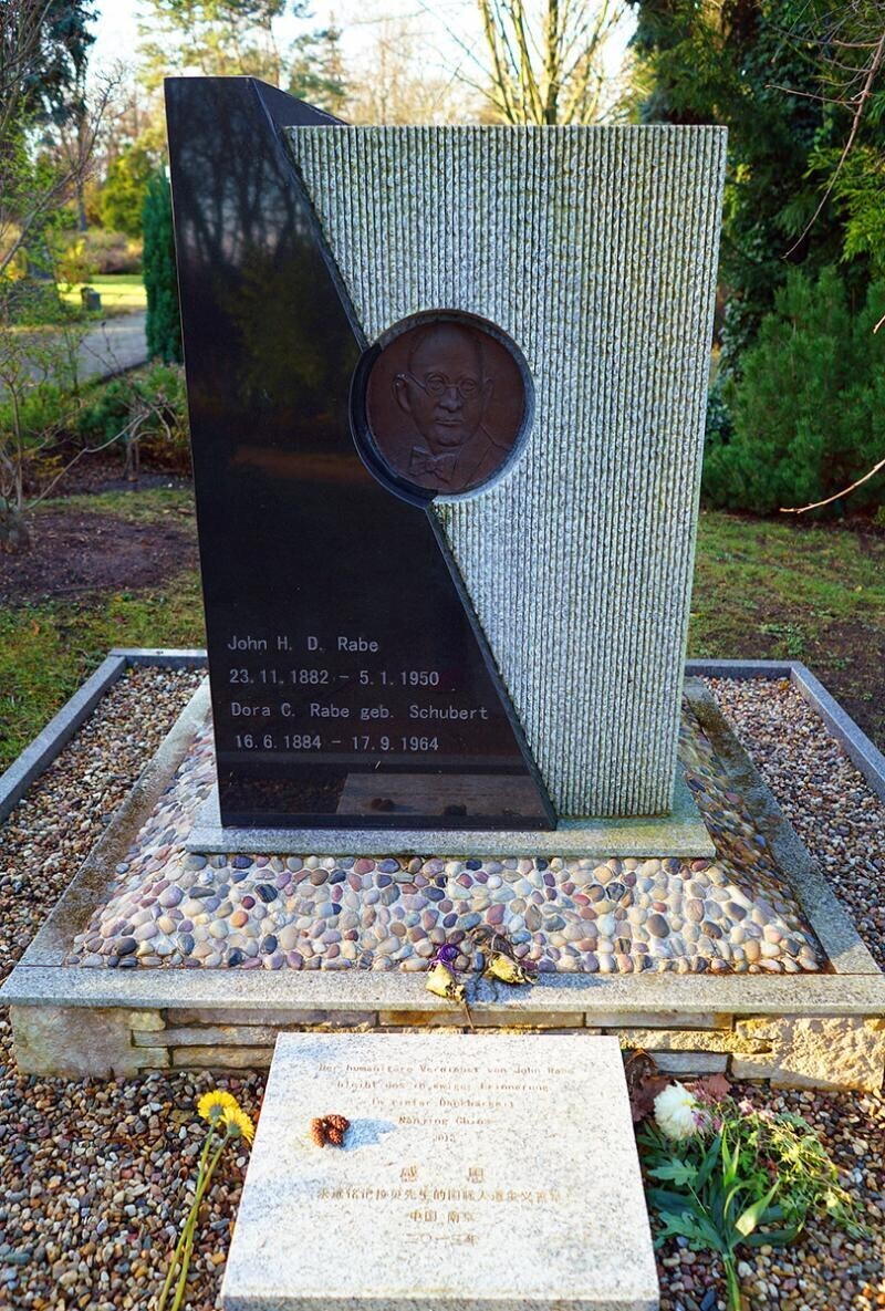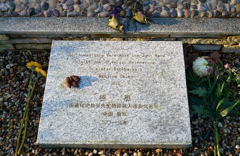 1937年末,西门子公司驻华代表约翰·拉贝与其他外国人牵头建立南京安全区,在日军屠刀下庇护了约25万中国难民,因此他也被称为“东方辛德勒”。拉贝的著作《拉贝日记》是南京大屠杀的翔实证据。2013年12月11日,由中国南京市捐建的拉贝先生纪念墓园在德国柏林落成。墓碑基座镶嵌着南京雨花石。