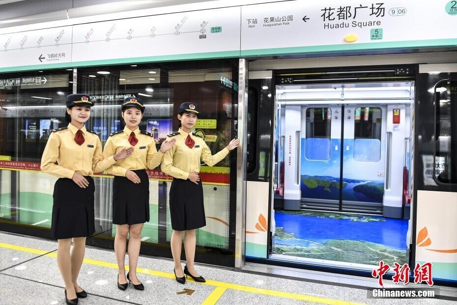 12月28日,广州地铁四号线南延段、九号线一期、十三号线一期和十四号线知识城支线开通试运营。四条新线开通后,广州地铁线网里程达到390.6公里。图为广州地铁9号线花都广场站。 中新社记者 陈骥旻 摄