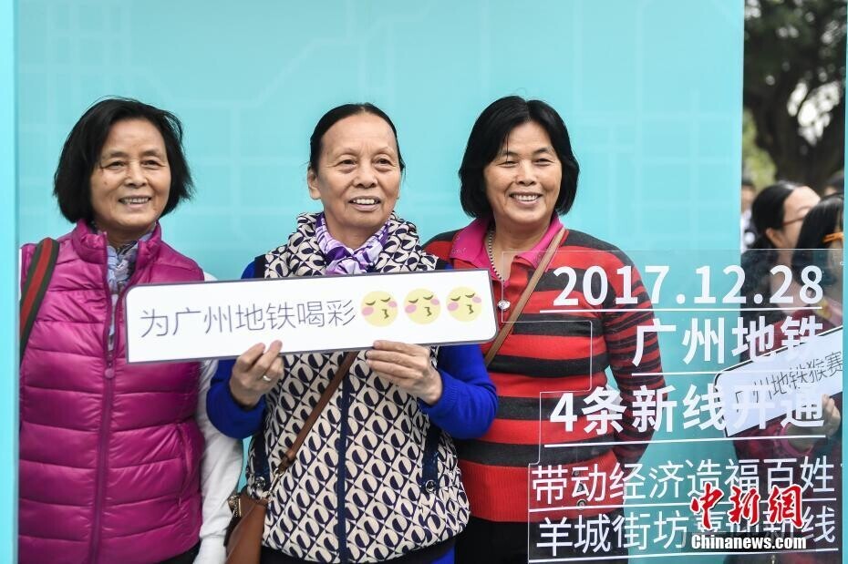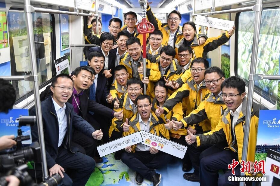 12月28日,市民代表在广州地铁9号线“美丽花都”号首发列车上合影留念。当日,广州地铁四号线南延段、九号线一期、十三号线一期和十四号线知识城支线开通试运营。 中新社记者 陈骥旻 摄