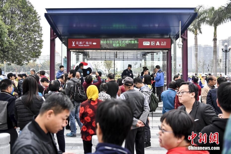 12月28日,市民来到广州地铁9号线花都广场站合影留念。当日,广州地铁四号线南延段、九号线一期、十三号线一期和十四号线知识城支线开通试运营。 中新社记者 陈骥旻 摄