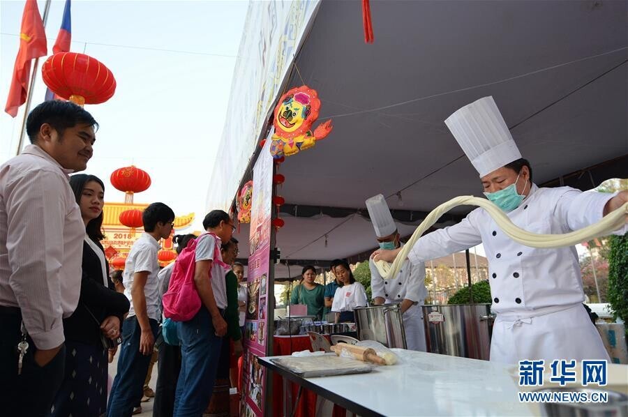 2月10日,在老挝首都万象,老挝民众在“欢乐春节”庙会现场观看抻面。当日,由老挝中国文化中心主办的2018年“欢乐春节”庙会活动在万象举行。 新华社发(刘艾伦 摄)
