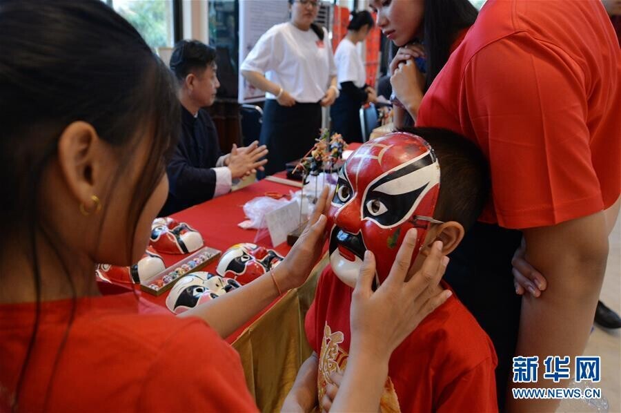 2月10日,在老挝首都万象,一名男孩在“欢乐春节”庙会上试戴脸谱面具。当日,由老挝中国文化中心主办的2018年“欢乐春节”庙会活动在万象举行。 新华社发(刘艾伦摄)