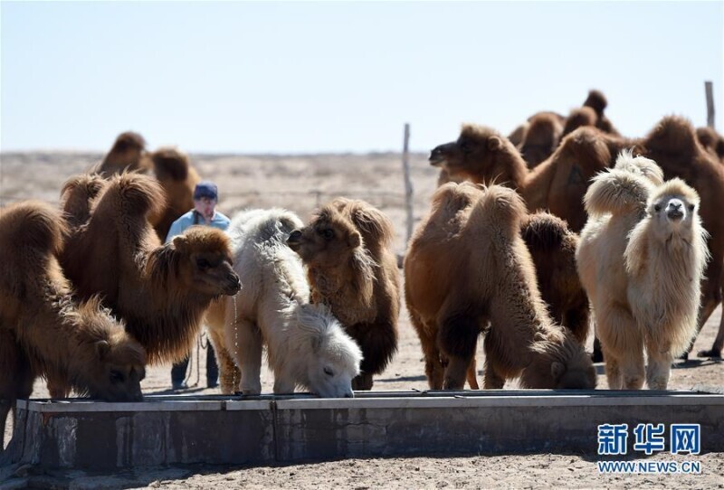 3月14日,阿拉善右旗阿拉腾敖包镇牧民阿都勒曹家的骆驼在饮水。