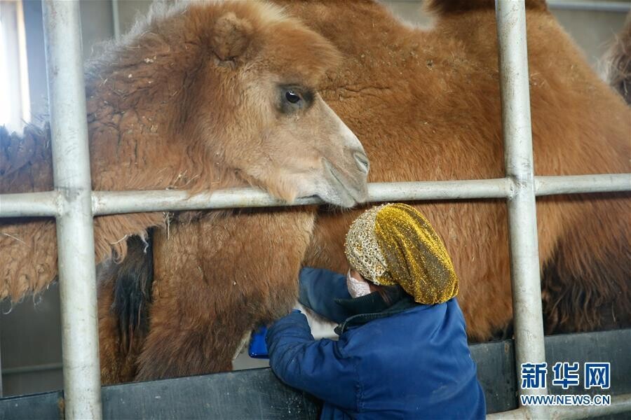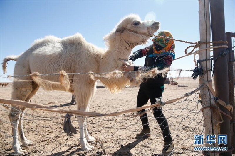 阿拉善右旗阿拉腾敖包镇牧民阿都勒曹在剪驼毛(3月14日摄)。她家目前养殖骆驼300多峰,每年卖驼奶、驼绒收入超过50万元。新华社记者 虞东升 摄