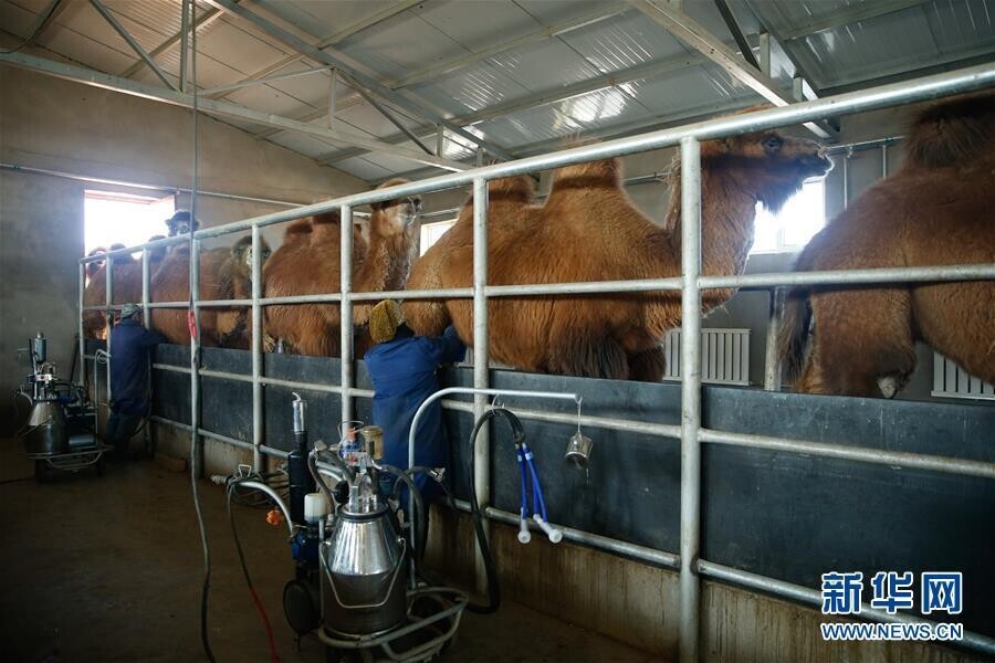 工人在阿拉善右旗阿拉腾敖包镇驼乡涌泉驼奶奶源示范基地挤驼奶(3月13日摄)。新华社记者 虞东升 摄