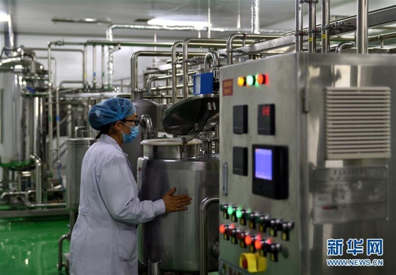 3月16日拍摄的内蒙古沙漠之神生物科技有限公司驼奶产品生产车间。该公司以20元每斤的价格向牧民收购驼奶,为牧民养骆驼提供了稳定的收入。新华社记者 任军川 摄