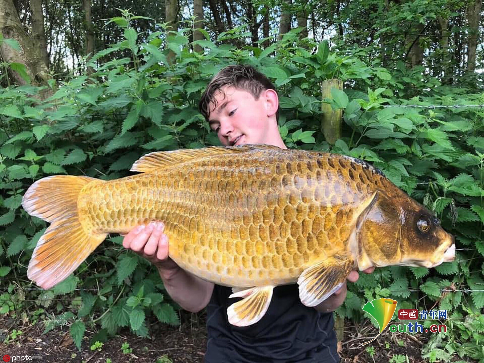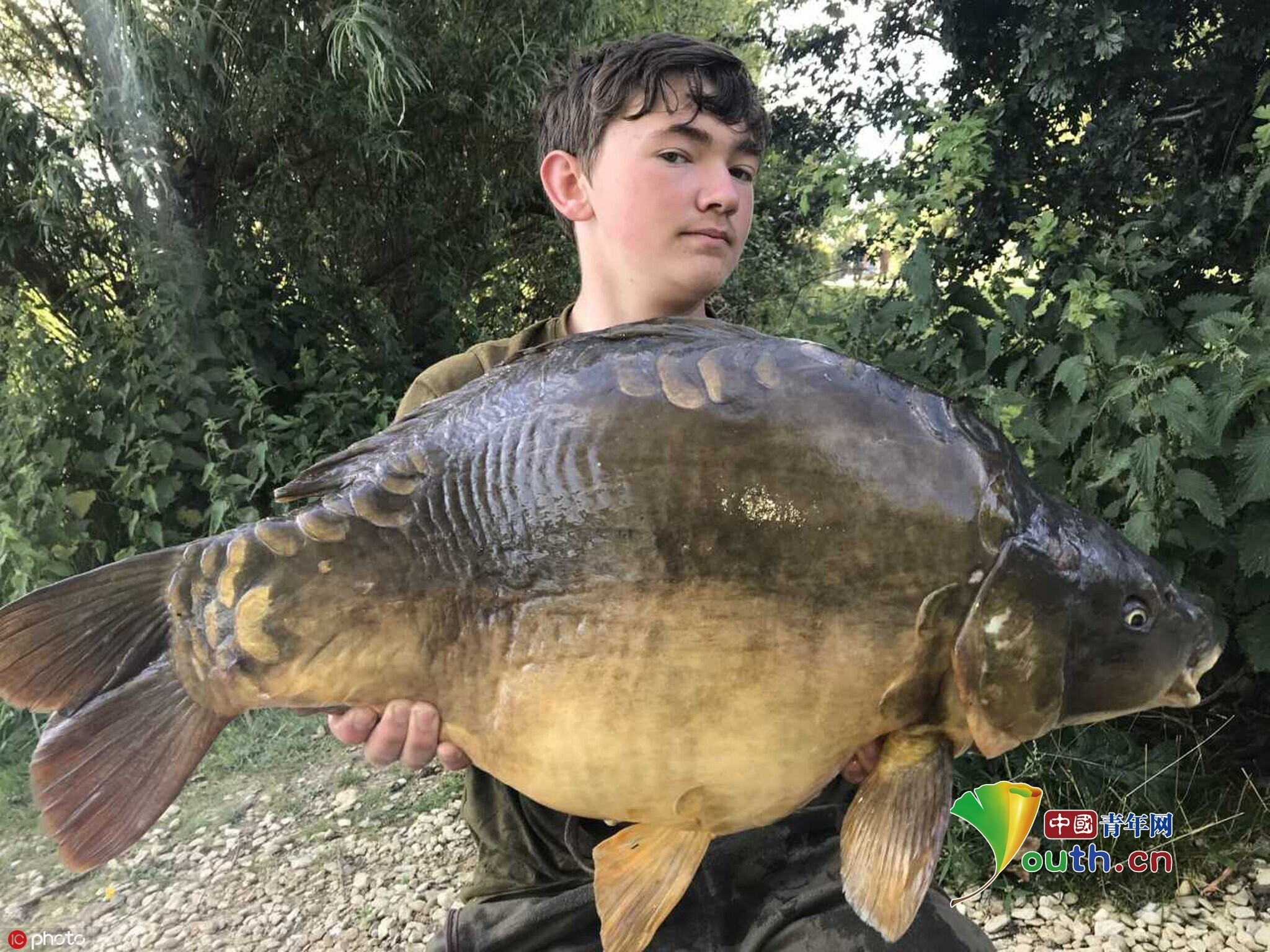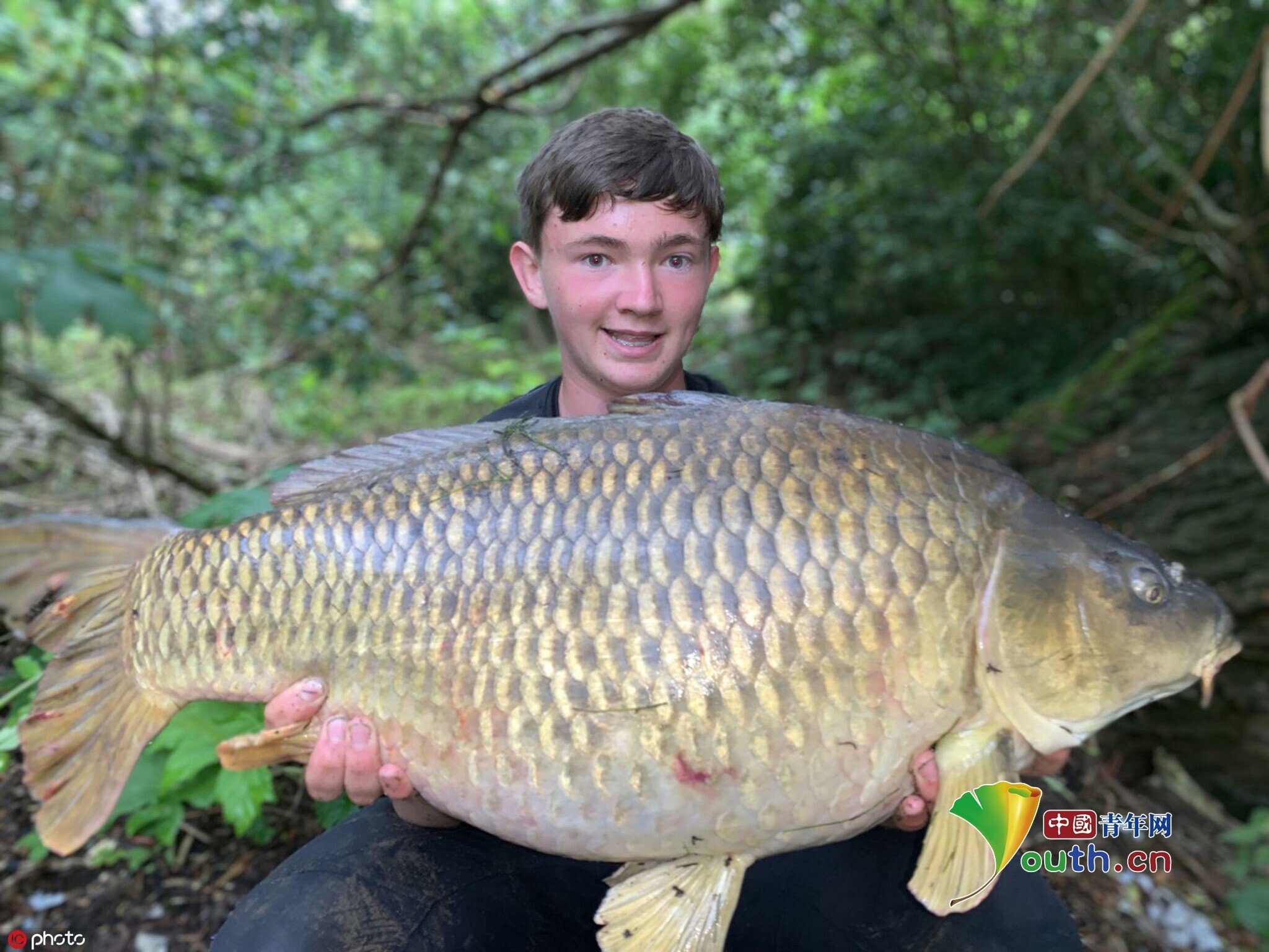 英国索尔福德,一个少年在河里钓到了一条25磅(约24斤)的鲤鱼,这是自1856年以来在那里钓到的最大的鲤鱼。图片署名: catersnews/IC photo