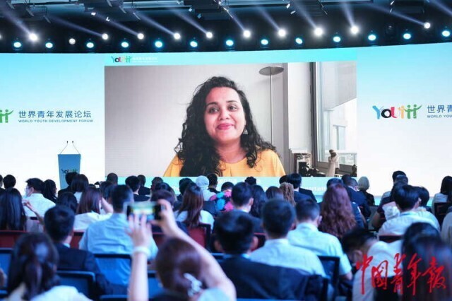 7月21日,北京,世界青年发展论坛全体会议上,联合国秘书长青年特使贾亚特玛·维克拉马纳亚克发表讲话。当日,世界青年发展论坛在京开幕,联合国秘书长青年事务特使、各国青年部长、国际青年组织负责人在全体会议上通过视频发表演讲。中青报·中青网记者 李隽辉/摄