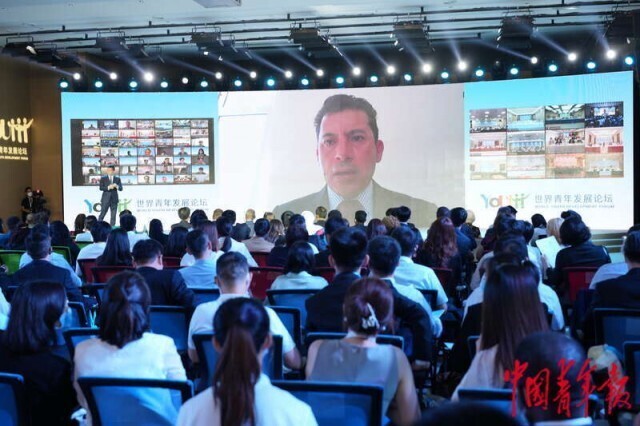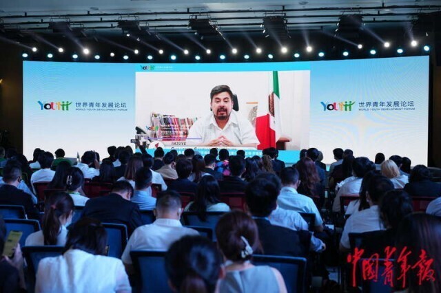 7月21日,北京,世界青年发展论坛全体会议上,墨西哥国家青年局局长吉列尔莫拉斐尔圣地亚哥罗德里格斯发表演讲。中青报·中青网记者李隽辉摄