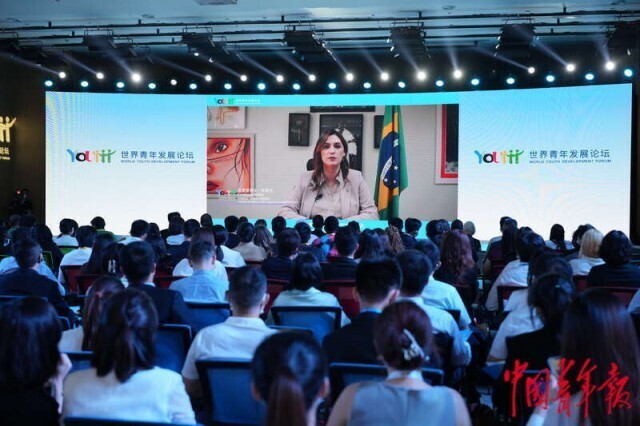 7月21日,北京,世界青年发展论坛全体会议上,巴西妇女、家庭和人权部部长克里斯蒂安·布里托发表演讲。中青报·中青网记者 李隽辉/摄