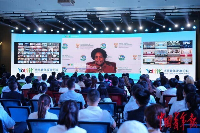 7月21日,北京,世界青年发展论坛全体会议上,南非总统府妇女、青年及残障部部长迈特恩科阿纳一马沙巴内发表演讲。中青报·中青网记者李隽辉摄