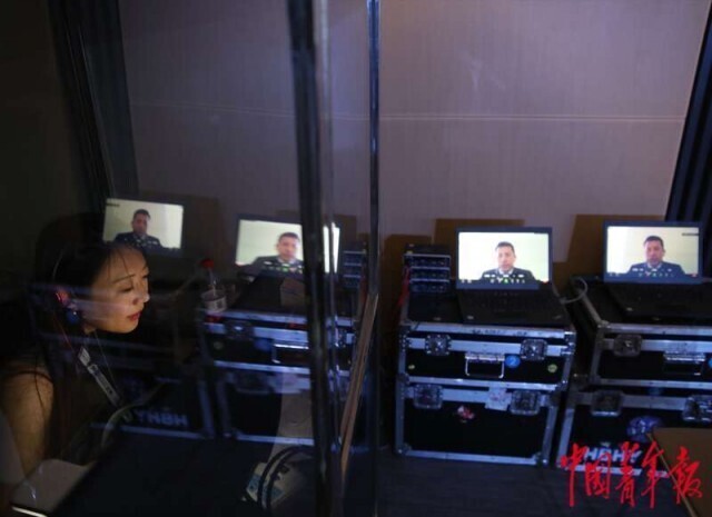 7月21日,北京,世界青年发展论坛全体会议上,工作人员在同声传译埃及青年事务与体育部部长阿什拉夫·苏布希的发言。中青报·中青网记者 陈剑/摄