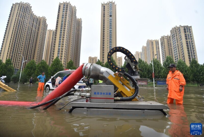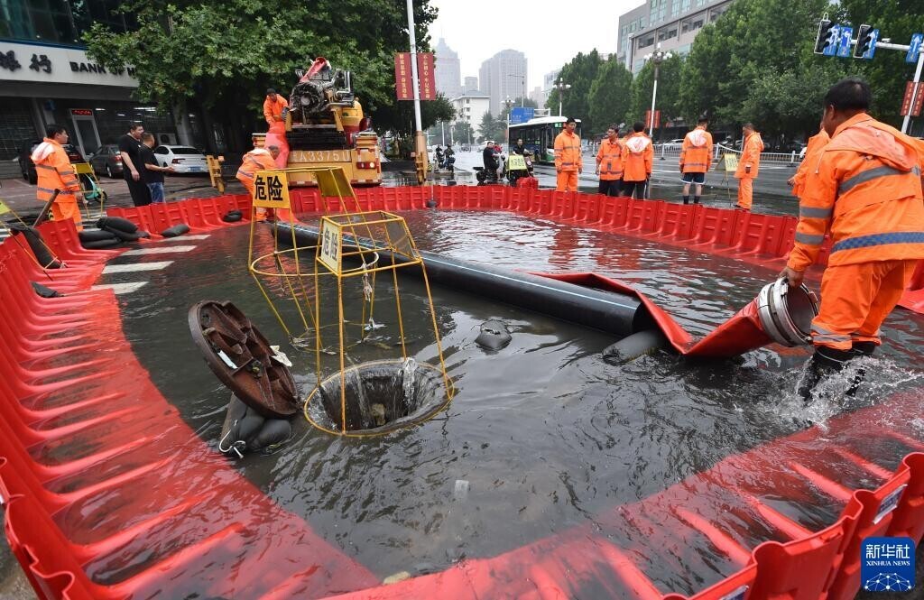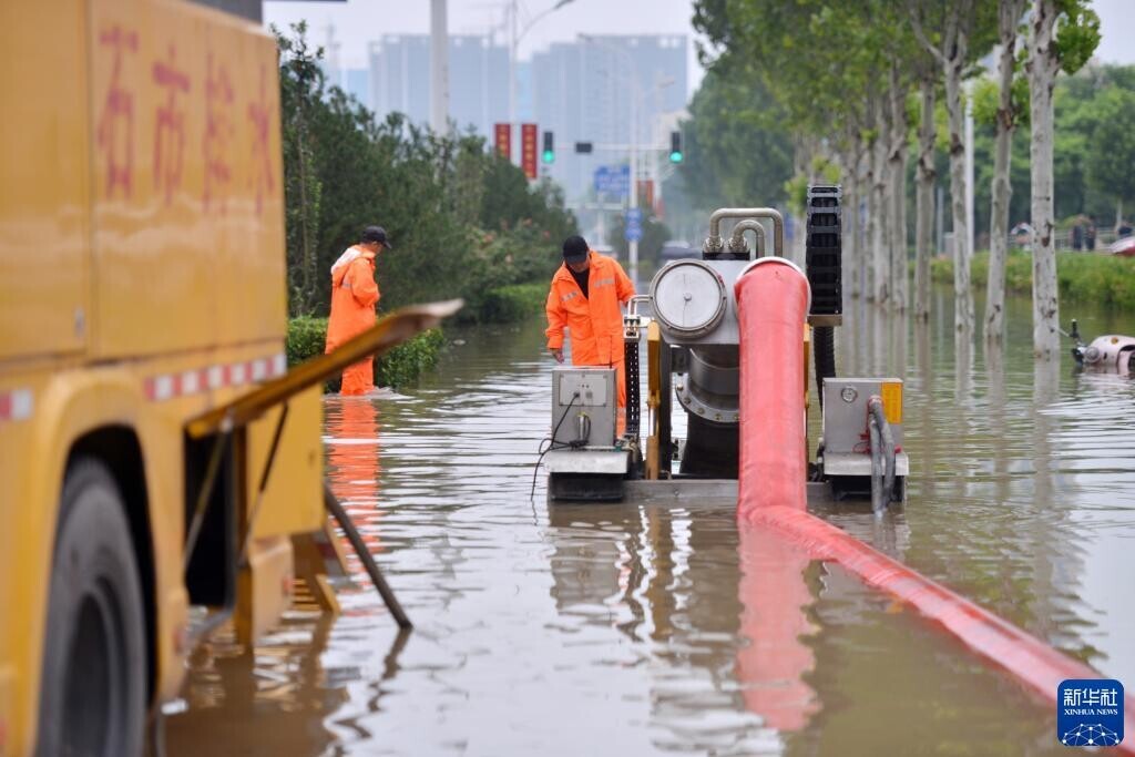 7月31日,在河北省石家庄市裕华路一处积水路段,工作人员进行紧急排水。