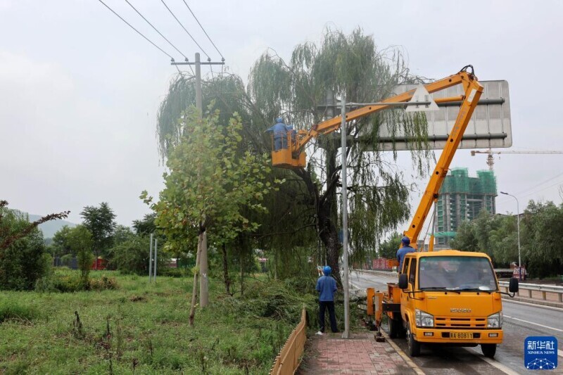 7月31日,在河北省石家庄市井陉县307国道长岗村段,供电部门工作人员对损毁线路进行抢修。