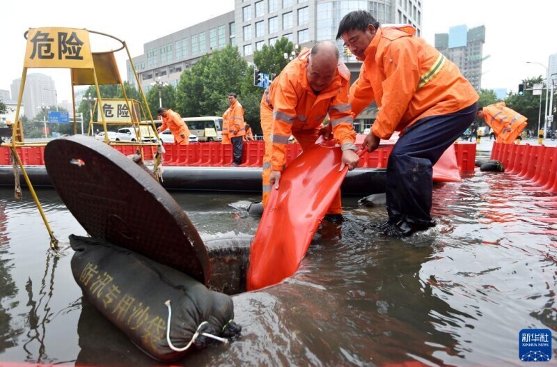 7月31日,工作人员在河北省石家庄市新华区北二环一个易积水点巡查。