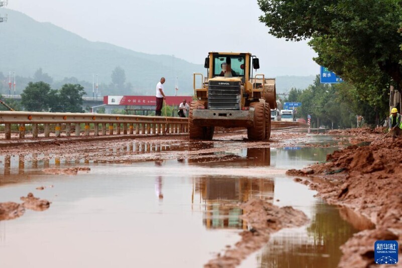 7月31日,在河北省井陉县307国道长岗村段,防汛工作人员驾驶机械清理淤泥。