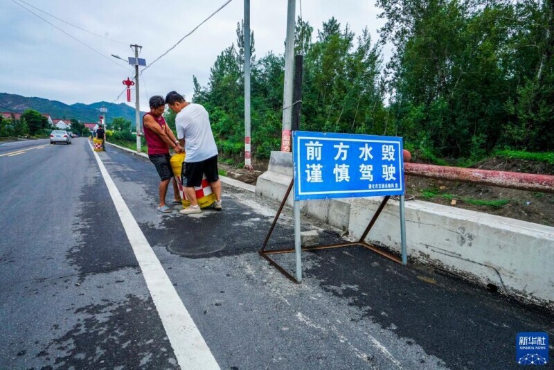 7月31日,工作人员在河北省遵化市罗文峪村南侧设置车辆通行提示标志。