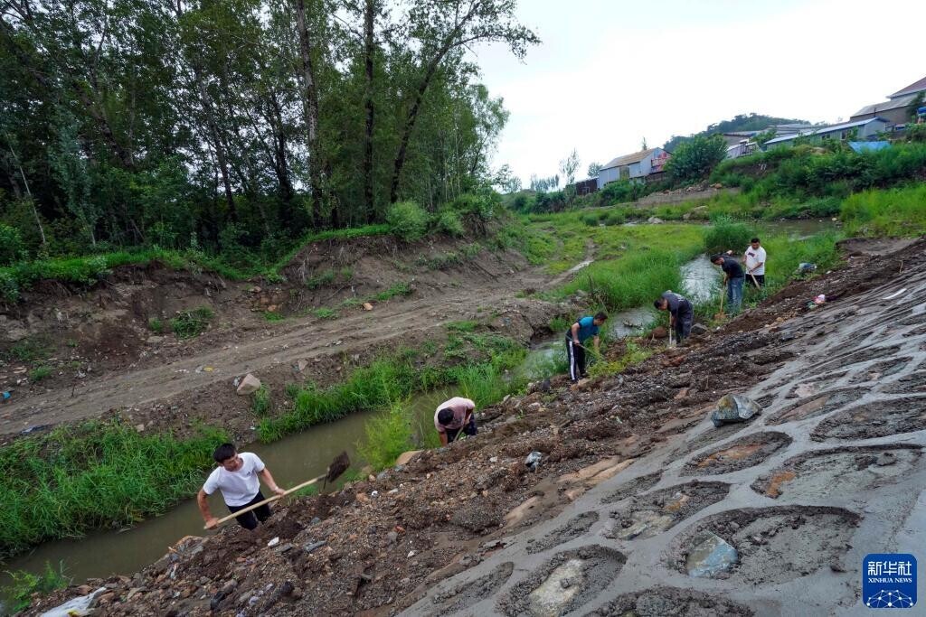 7月31日,河北省遵化市罗文峪村农民在加固河坝。