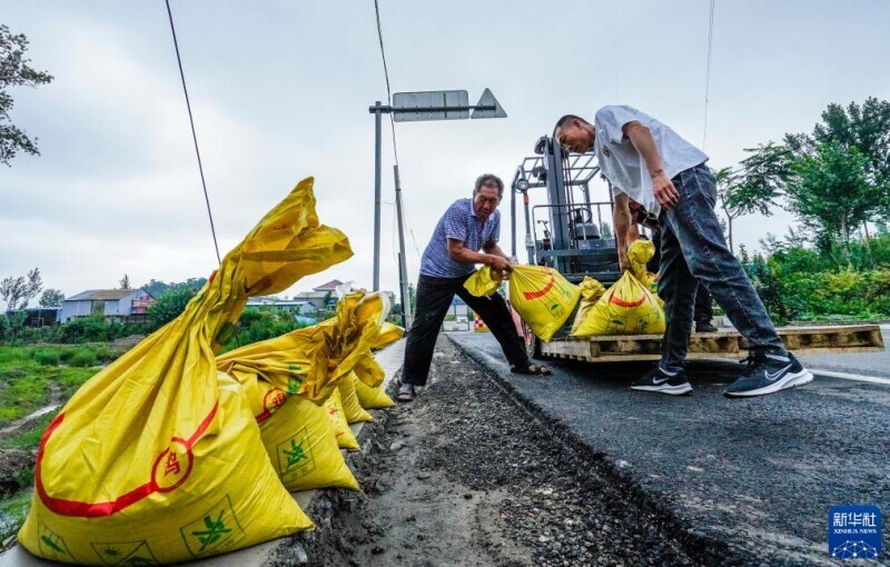 7月31日,河北省遵化市罗文峪村农民在河道旁堆放防洪沙袋。