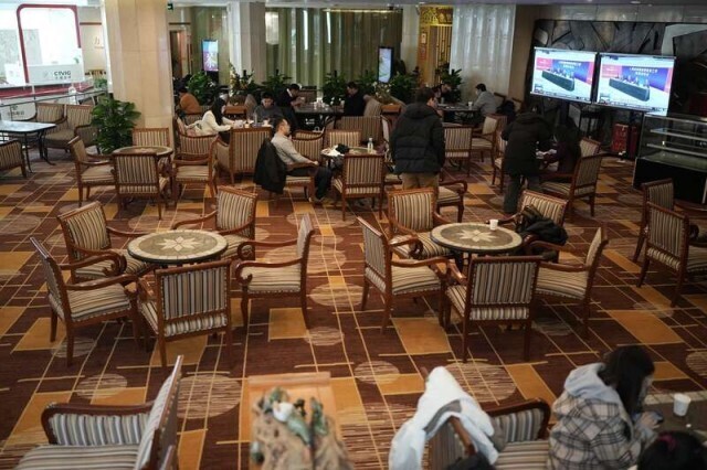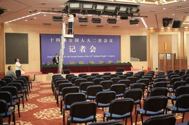 2月27日,北京梅地亚中心,新闻中心的发布厅中,座椅已经摆放好。中青报·中青网记者 李隽辉/摄