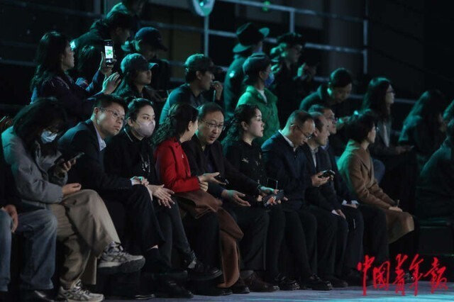3月20日,北京正大中心,AW2024北京时装周“为人民而设计——行循自然”北服师生优秀作品秀现场,台下观众在交流。中青报·中青网记者 孔斯琪/摄