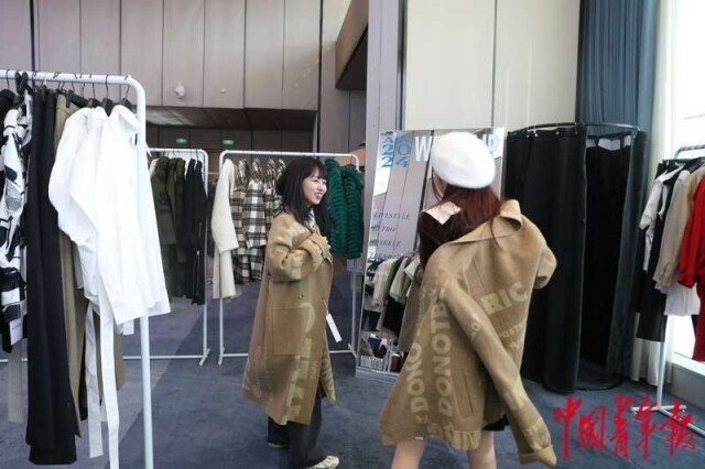 3月20日,北京正大中心,AW2024北京时装周WEEK UP潮流展上,观赏完北服师生优秀作品秀后,来自北京服装学院的研究生李心怡(左)跟朋友试穿国内原创设计品牌服装。李心怡坦言,比起国外的“快消”品牌,她更愿意为国内原创设计师的作品买单。她认为现在年轻人对于服饰的审美越来越个性化、多样化,原创设计师的作品更能满足这类需求;近年来国内越来越多青年设计师重视环保、健康的设计理念也是吸引她关注和购买的原因。中青报·中青网记者 孔斯琪/摄
