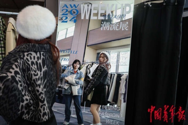 3月20日,北京正大中心,AW2024北京时装周WEEK UP潮流展上,观赏完北服师生优秀作品秀后,来自中央民族大学的大二学生朱雨含跟朋友们在选购国内原创设计品牌服装。作为AW2024北京时装周的官方展会,这场潮流展汇集了限量甄选优秀设计师品牌,为其提供展示、推广、交流、订货与销售服务,帮助品牌实现商业转换,扩大时尚影响力。中青报·中青网记者 孔斯琪/摄