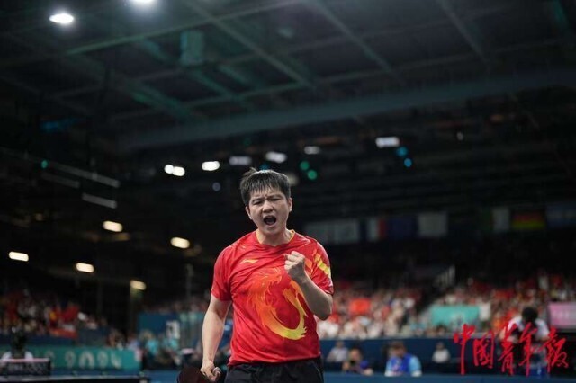 当地时间8月4日下午,法国巴黎南巴黎竞技场,巴黎奥运会乒乓球男单决赛,中国选手樊振东在赢球后庆祝。当日的比赛中,樊振东在先丢一局的情况下连胜四局,以4:1逆转战胜瑞典选手莫雷高德,拿下个人的首个奥运会乒乓球男单冠军,完成了职业生涯的大满贯。中青报·中青网记者 李隽辉/摄