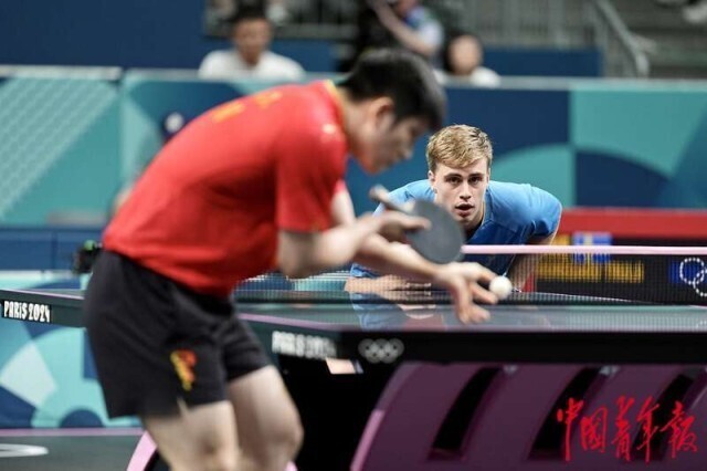 当地时间8月4日下午,法国巴黎南巴黎竞技场,巴黎奥运会乒乓球男单决赛,瑞典选手莫雷高德在比赛中。此前举行的乒乓球男单32强赛中,莫雷高德爆冷淘汰头号种子中国选手王楚钦。中青报·中青网记者 李隽辉/摄