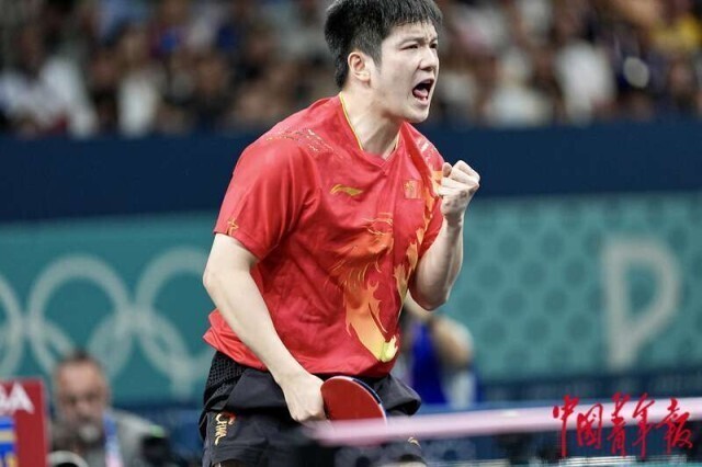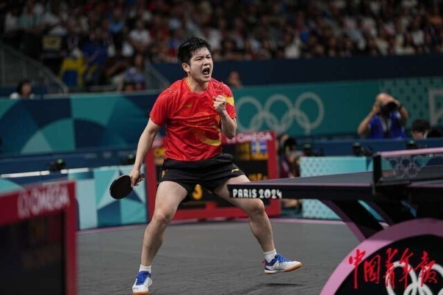 当地时间8月4日下午,法国巴黎南巴黎竞技场,巴黎奥运会乒乓球男单决赛,中国选手樊振东庆祝得分。中青报·中青网记者 李隽辉/摄