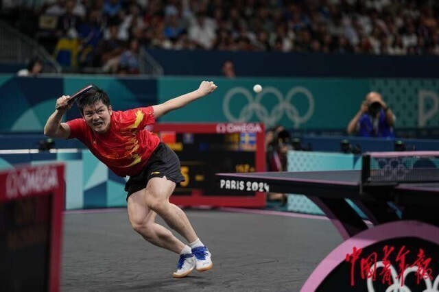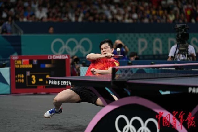 当地时间8月4日下午,法国巴黎南巴黎竞技场,巴黎奥运会乒乓球男单决赛,樊振东在比赛中。中青报·中青网记者 李隽辉/摄