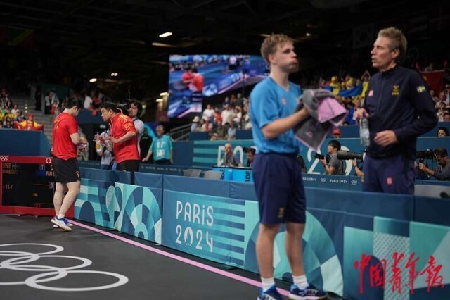 当地时间8月4日下午,法国巴黎南巴黎竞技场,巴黎奥运会乒乓球男单决赛,双方选手与教练交流。中青报·中青网记者 李隽辉/摄