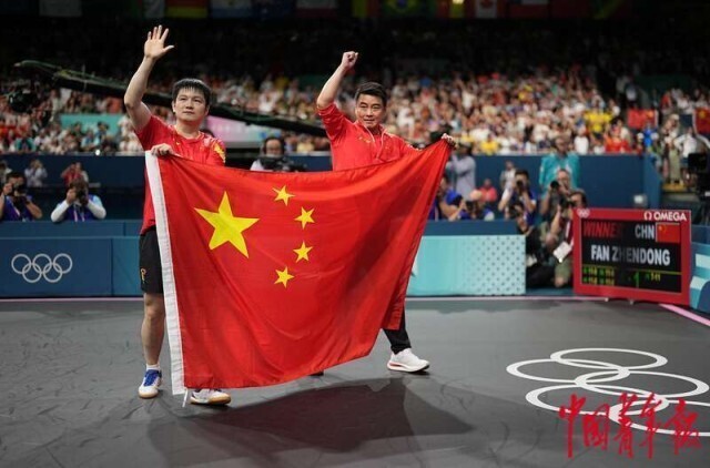 当地时间8月4日下午,法国巴黎巴黎竞技场,巴黎奥运会乒乓球男单决赛后,樊振东与教练王皓手持国旗庆祝胜利。中青报·中青网记者 李隽辉/摄
