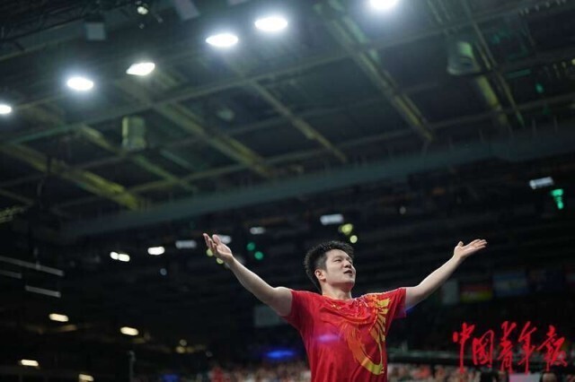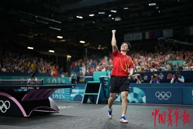 当地时间8月4日下午,法国巴黎巴黎竞技场,巴黎奥运会乒乓球男单决赛后,樊振东庆祝胜利。中青报·中青网记者 李隽辉/摄