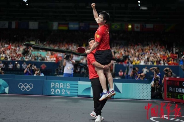 当地时间8月4日下午,法国巴黎巴黎竞技场,巴黎奥运会乒乓球男单决赛后,教练王皓将樊振东抱起庆祝胜利。中青报·中青网记者 李隽辉/摄