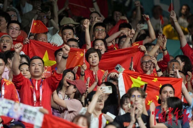 当地时间8月4日下午,法国巴黎巴黎竞技场,巴黎奥运会乒乓球男单决赛,乒乓球世界冠军张怡宁在看台上为中国队加油。中青报·中青网记者 李隽辉/摄