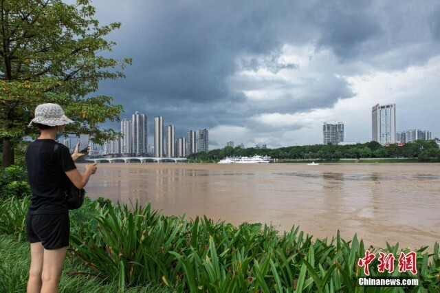 9月9日,广西南宁邕江水位上涨,民生广场一带沿岸被淹。广西南宁水文中心南宁水文中心站当日升级发布洪水黄色预警,根据郁江上游左江干支流最新洪水情况分析,预计未来24小时—48小时,南宁多个河段将出现超警洪水,提请民众及有关单位加强防范,及时避险。图为市民在邕江沿岸拍摄洪水。