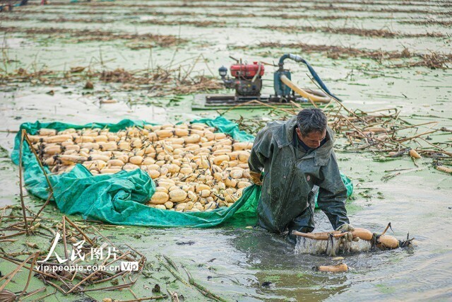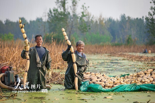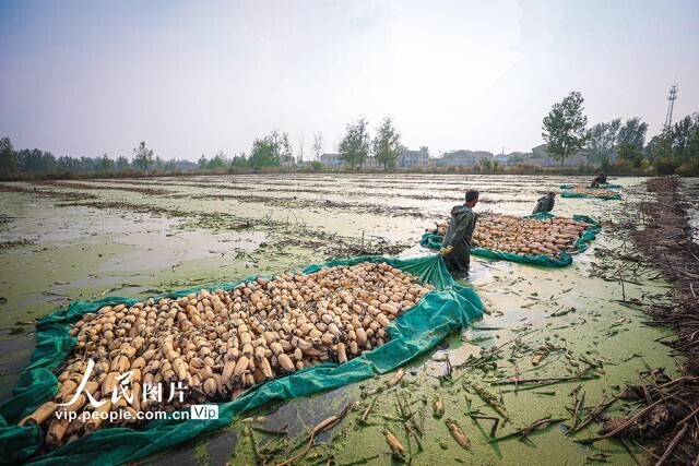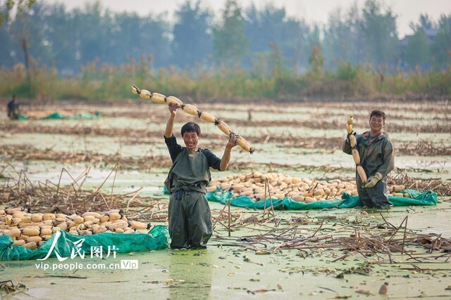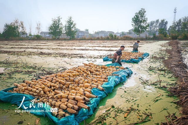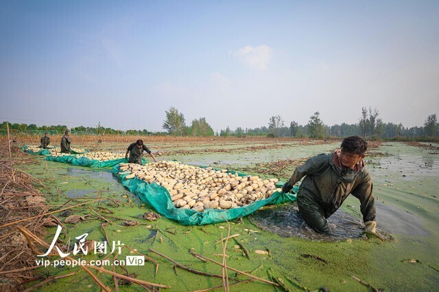 2024年10月11日,在江苏省徐州市铜山区房村镇八王村,当地村民种植了近千亩的鄂莲七号喜获丰收。许晨摄(人民图片网)