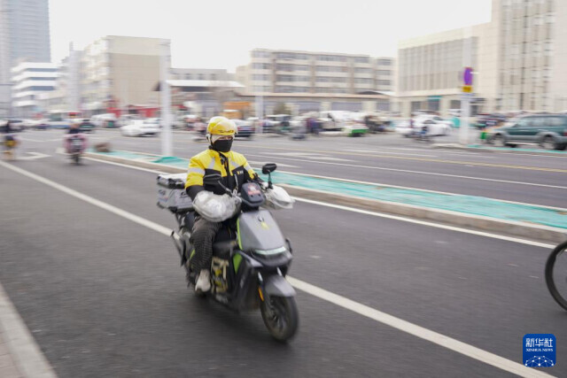 戚德敏在山西省太原市小店区的一处商圈等待订单(1月29日摄)。