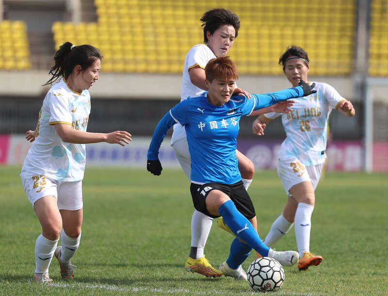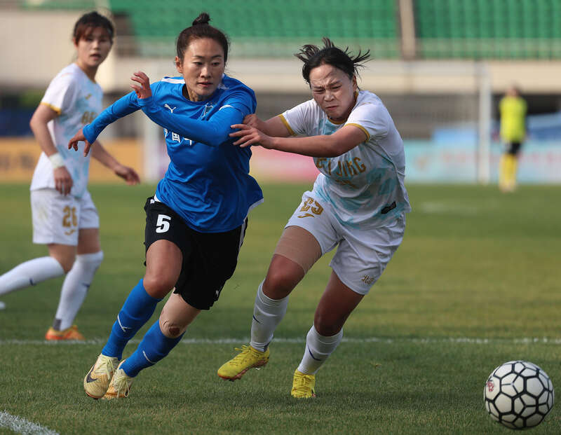 4月22日,北京先农坛体育场,2023中国足球协会女子足球超级联赛上,北京队8号李曏(左一)解围。刘占崑/摄