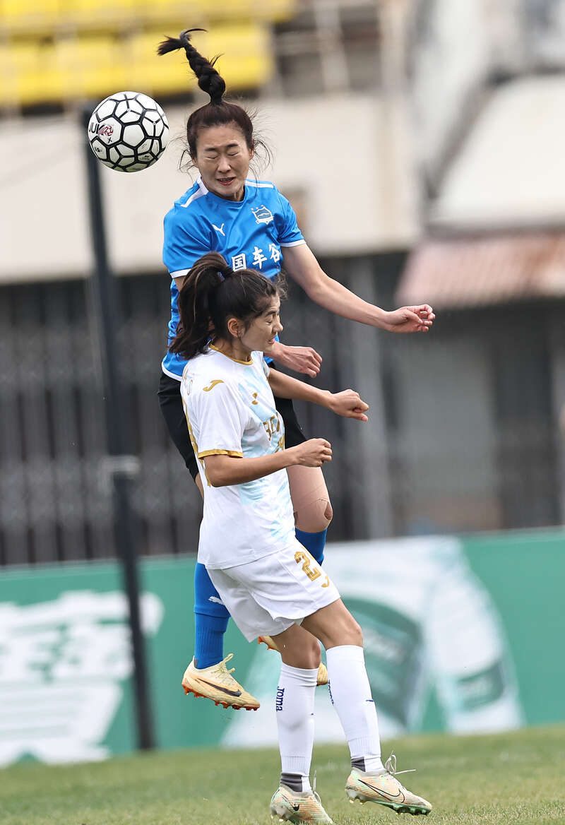 4月22日,北京先农坛体育场,2023中国足球协会女子足球超级联赛上,武汉队5号吴海燕头球解围。刘占崑/摄