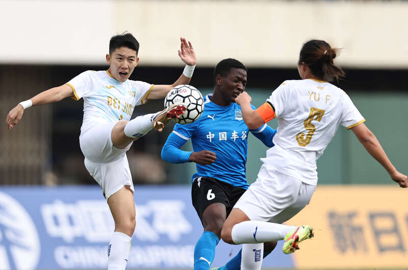 4月22日,北京先农坛体育场,2023中国足球协会女子足球超级联赛上,北京女足两名队员夹防武汉队外援的进攻。刘占崑/摄