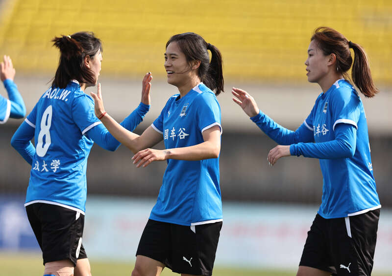 4月22日,北京先农坛体育场,2023中国足球协会女子足球超级联赛上,武汉队10号姚伟与队友庆祝第三个进球。刘占崑/摄