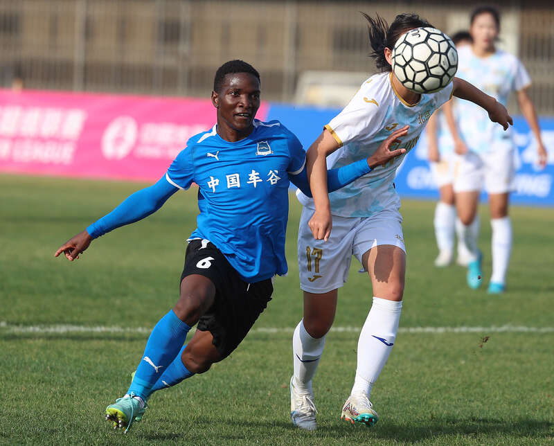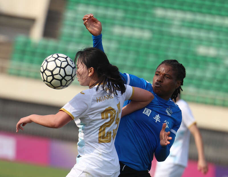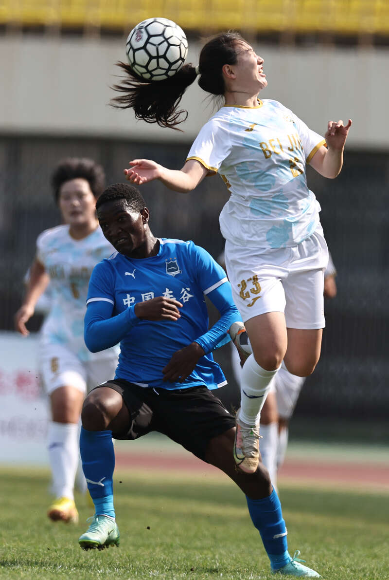 4月22日,北京先农坛体育场,2023中国足球协会女子足球超级联赛上,北京队23号潘格格(前)头球阻止武汉队外援特姆瓦的突破。刘占崑/摄