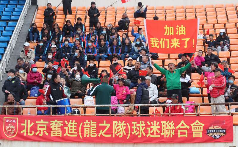 4月22日,北京先农坛体育场,2023中国足球协会女子足球超级联赛上,北京女足的球迷们在现场加油助威。刘占崑/摄