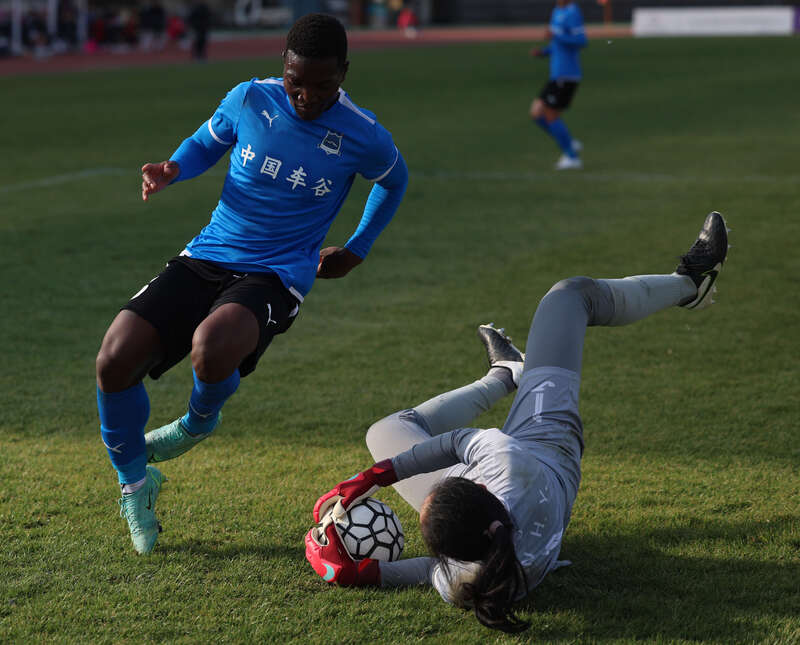 4月22日,北京先农坛体育场,2023中国足球协会女子足球超级联赛上,北京队守门员潘红艳(右)出击救球,阻拦武汉队外援特姆瓦的进攻。刘占崑/摄