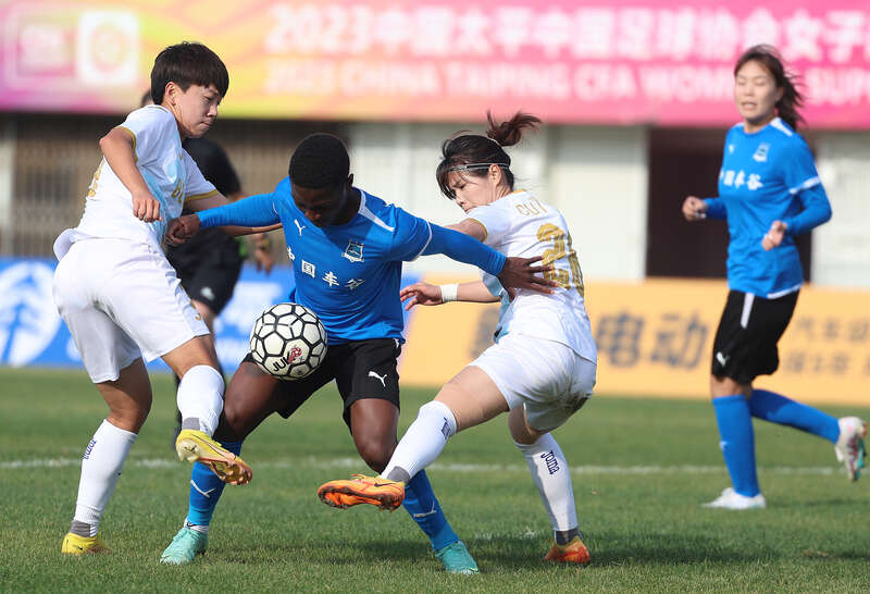 4月22日,北京先农坛体育场,2023中国足球协会女子足球超级联赛上,北京队3人协防武汉队18号马君的进攻。刘占崑/摄