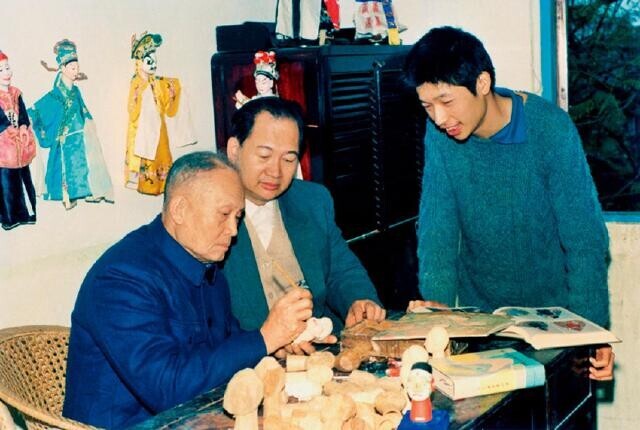 图22 徐竹初(图右)正在指导年轻人雕刻木偶头