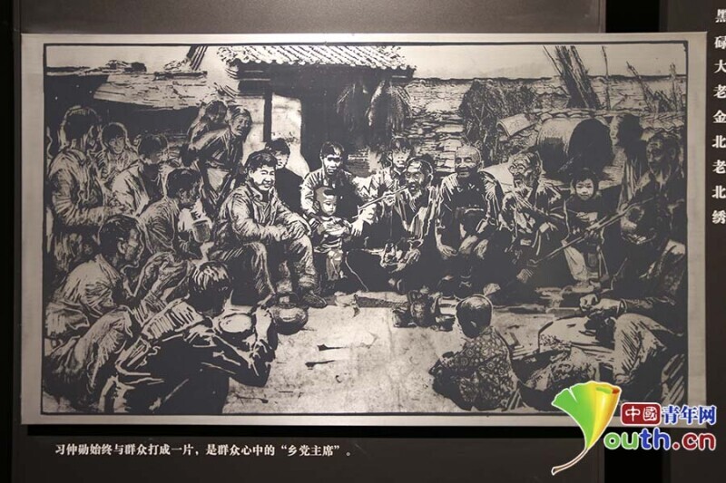 展厅内有一幅反映习仲勋与当地群众打成一片的展品。讲解员介绍,习近平曾在参观至此时,向身边人解释了陕西话中“乡党”一次的含义。中国青年网记者 李拓 摄