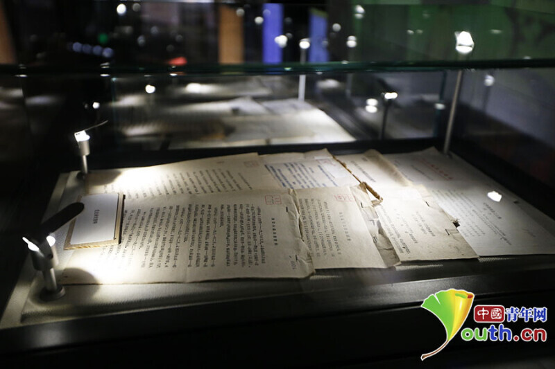 展厅内展示出的珍贵文字资料。中国青年网记者 李拓 摄